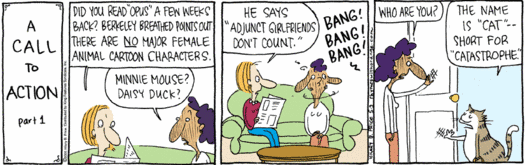Never one to allow injustice in the comic strip world, Hilary Price (a Massachusetts resident) has introduced, Monty-like, a new (disposable?) character. Bets on how long Ms. Catastrophe will last?